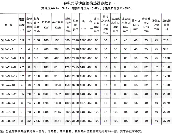 容积式浮动盘管换热器的选用主要根据用水的流量,表中水流量指的是连续供水时的工况,当间断供水时,可适当减少换热器的型号。也可以根据用户的工况和要求,在某种型号罐体的基础上适当加大或减少盘管的换热面积。罐壳体积的承压力一般为1.0Mpa,也可根据用户的工况和要求,提高罐体的压力等级。